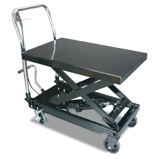 - Cette table élévatrice hydraulique mobile peut positionner et soulever les pièces en pompant simplement la pédale pratique. L'abaissement est également facile avec un levier à main pour une libération contrôlée. Ce chariot de table pratique comprend un tapis en caoutchouc résistant à l'huile pour éviter le glissement et deux roulettes pivotantes verrouillables pour une maniabilité facile.